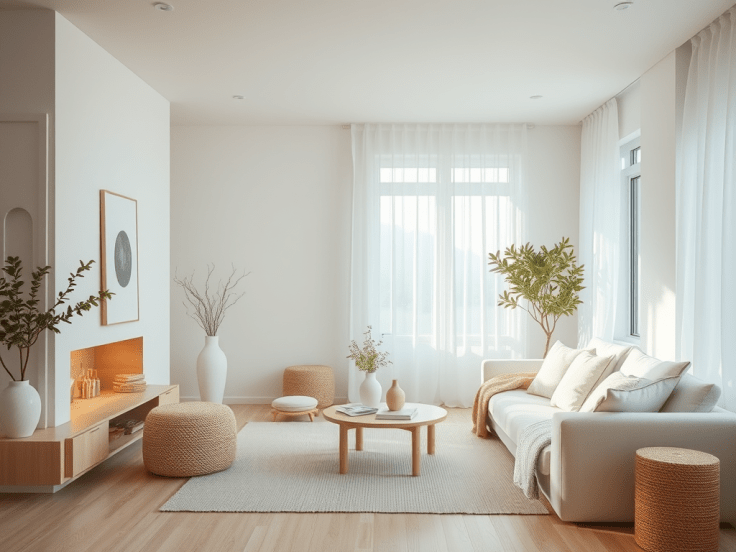 - Décor : Limitez-vous à 2-3 éléments (ex. : un tableau, une plante, un vase).