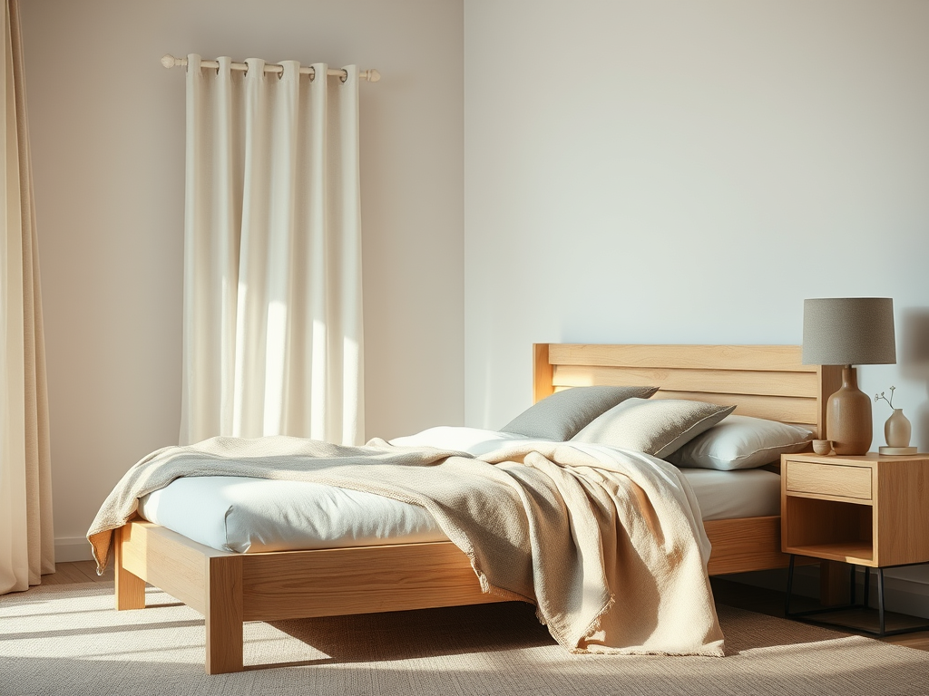- Application : Optez pour un cadre de lit en bois blond, des rideaux en lin et un plaid en laine. Une touche de céramique mate (vase, lampe) renforce l’élégance naturelle.