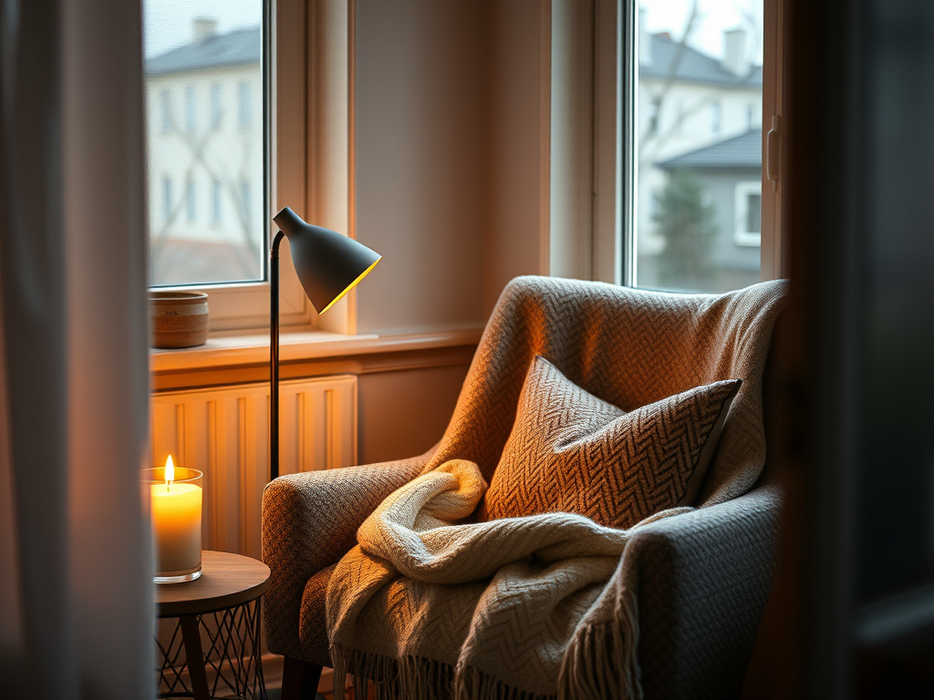 - Application : Créez un coin lecture avec un fauteuil en tissu, un plaid et une petite lampe. Ajoutez une bougie parfumée au bois de cèdre pour une ambiance relaxante.