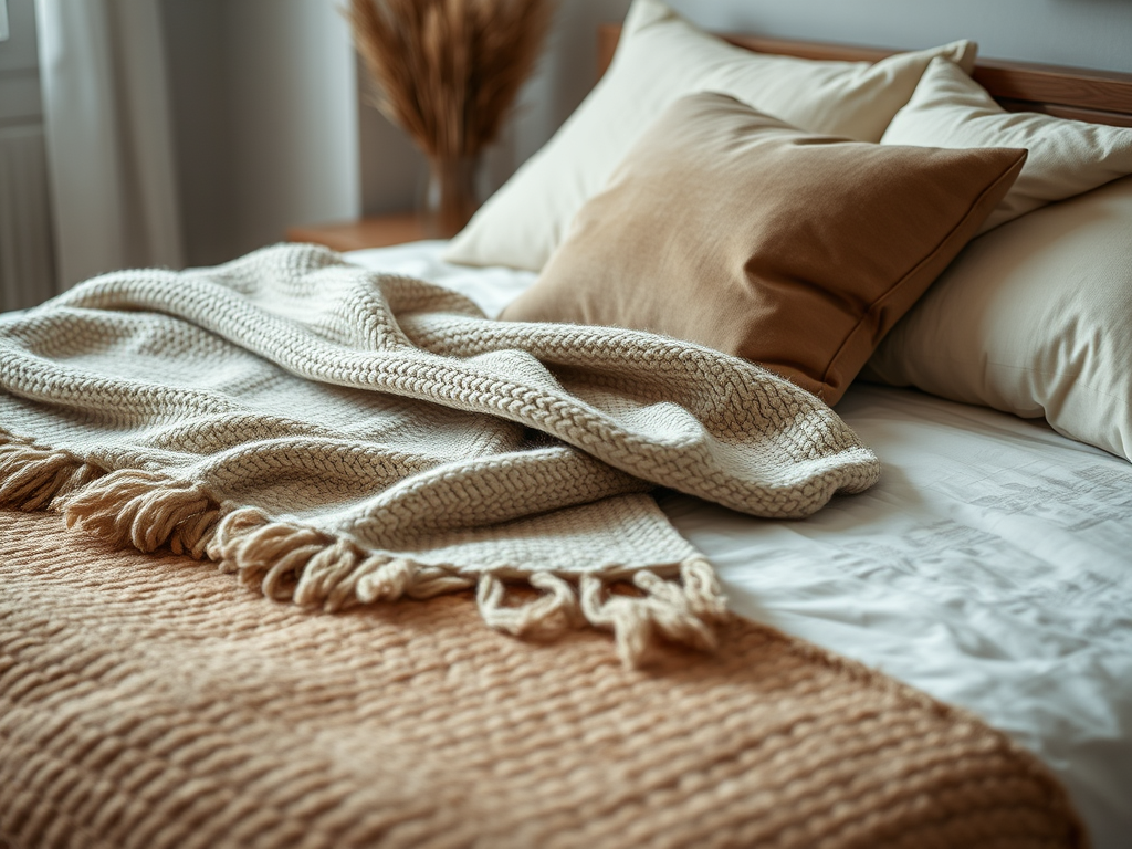 - Application : Superposez un tapis en jute et un plaid en laine sur le lit. Choisissez des housses de coussin dans des textures variées (coton brossé, velours mat).
