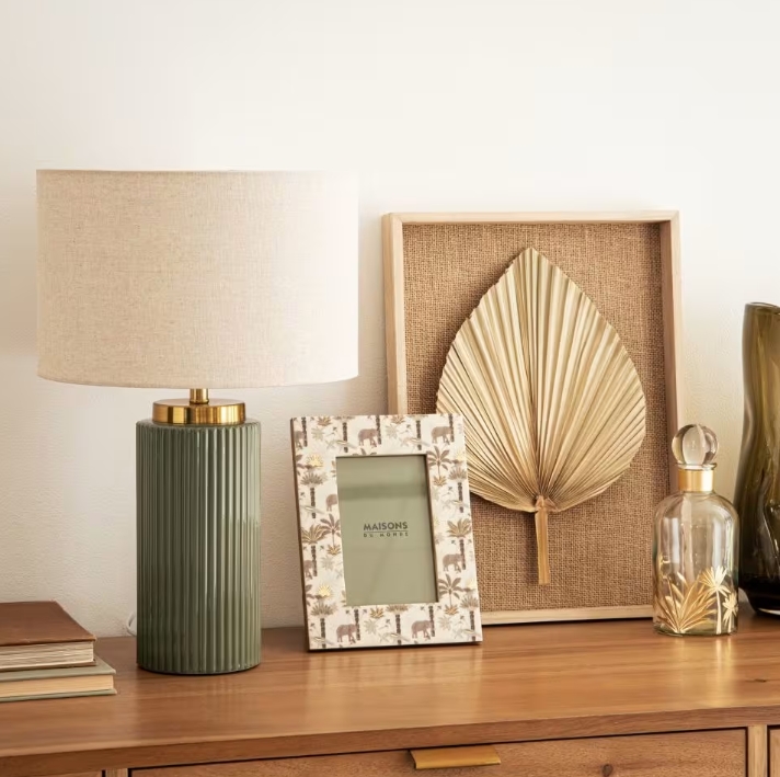Vigo – Lampe en céramique striée verte et dorée et abat-jour en polyester recyclé beige crème 39,99 € chez Maisons du Monde