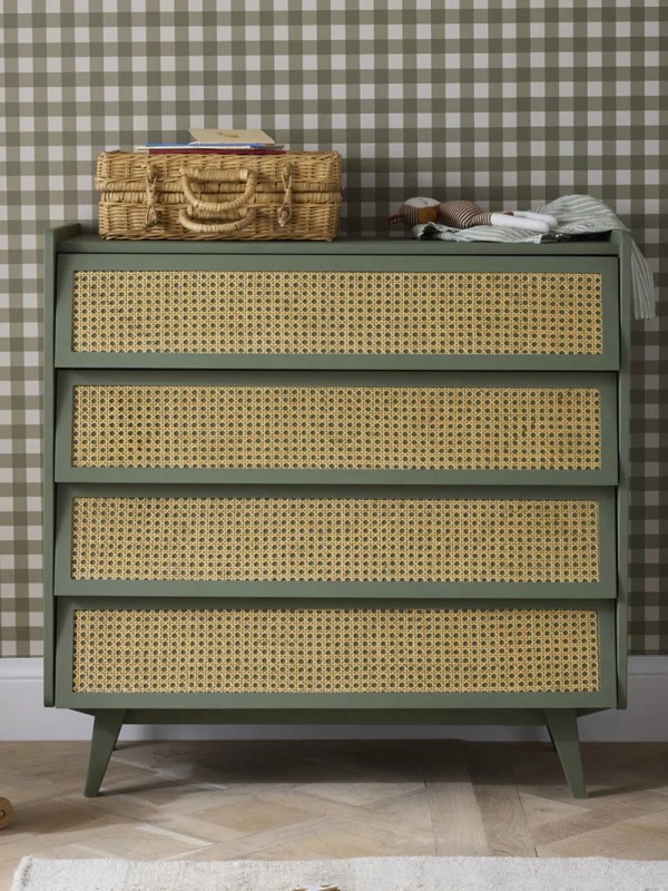 Ligne rétro, coloris actuel et cannage authentique. Tout est réuni pour obtenir une commode élégante et parfaitement dans l’air du temps. Commode composée de 4 larges tiroirs obliques recouverts de cannage et montés sur glissières métalliques chez Cyrillus