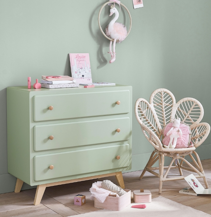 Sweet – Commode compatible plan à langer 3 tiroirs verte elle est prête à débarquer dans la déco de chambre de votre enfant et le résultat fera l’unanimité. On craque pour son look scandinave et la douceur de ce vert qui a de quoi vous charmer. Maisons du Monde 249,00 €