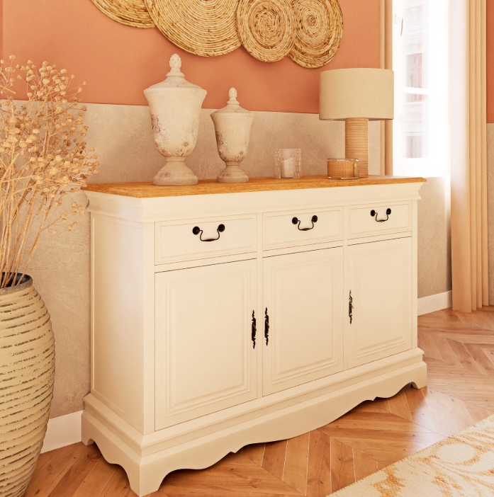 Retrouvez le charme des meubles d’antan avec le buffet 3 portes 3 tiroirs crème LEONTINE ! Travaillé avec une patine crème et une finition vieillie, ce buffet offrira un petit air de campagne à votre séjour. Maisons du Monde 469,00 €